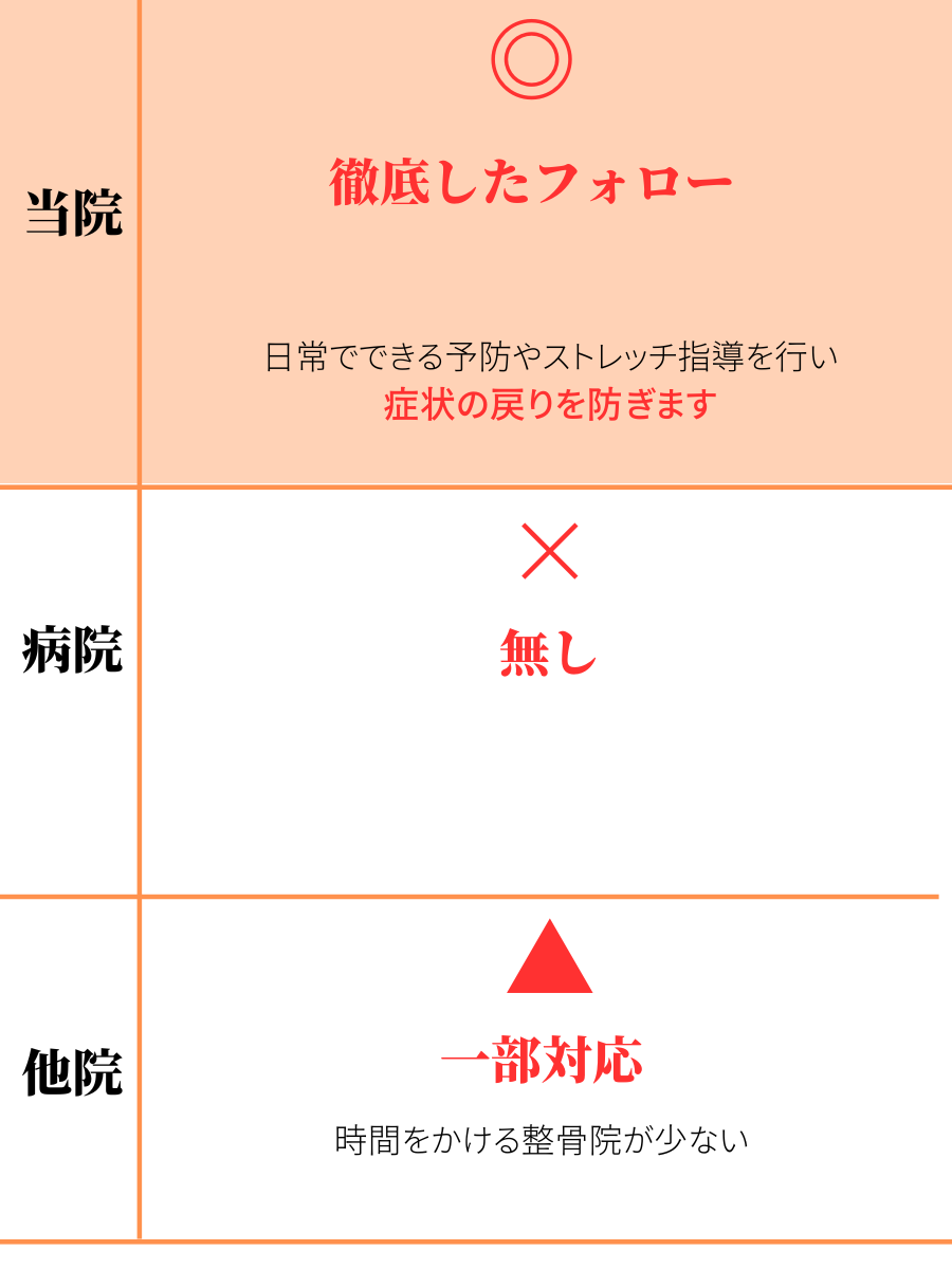 施術後、元の状態に戻ってしまうことはよくあることですが、当院ではそのような戻りを抑えるために、日常生活で体に負担をかけないような動き方をお教えしております。また、効果的な体のストレッチも推奨しておりますので、最短での改善を目指して頂く事ができます。