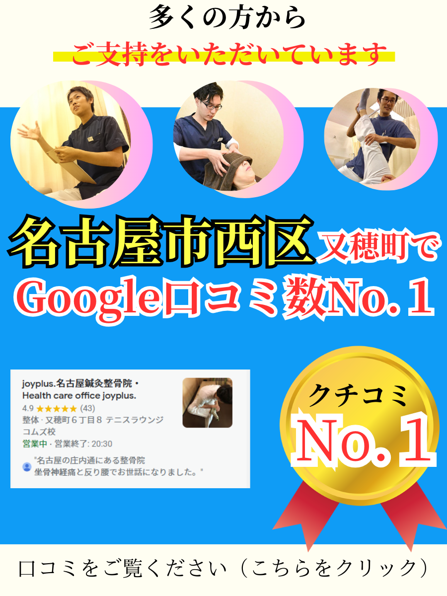 joyplus.鍼灸整骨院に働く先生方は知識も技術も豊富でまた人柄もよく、誰からも愛されている先生が多く在籍されています。 新しい技術を取り入れ、遠くからでも患者様が来院されていると伺っております。 名古屋市には数多くの整骨院がありますが、 どこへ行っても治らなかったと諦めている方へ自信をもってオススメ出来る鍼灸整骨院です。       joyplus.鍼灸整骨院グループは様々な、経験を持ったセラピストが多く在籍し、丁寧なカウンセリングと確かな技術でお客様に合った施術を、その場限りの慰安施術ではなくお客様の健康を真剣に考える施術院です。 また、再発防止への取り組みにも力を入れています。専門のセラピストがエクササイズや運動指導も親身になって対応してもらえますので体の痛みでお困りの方は是非一度ご相談してみて下さい。